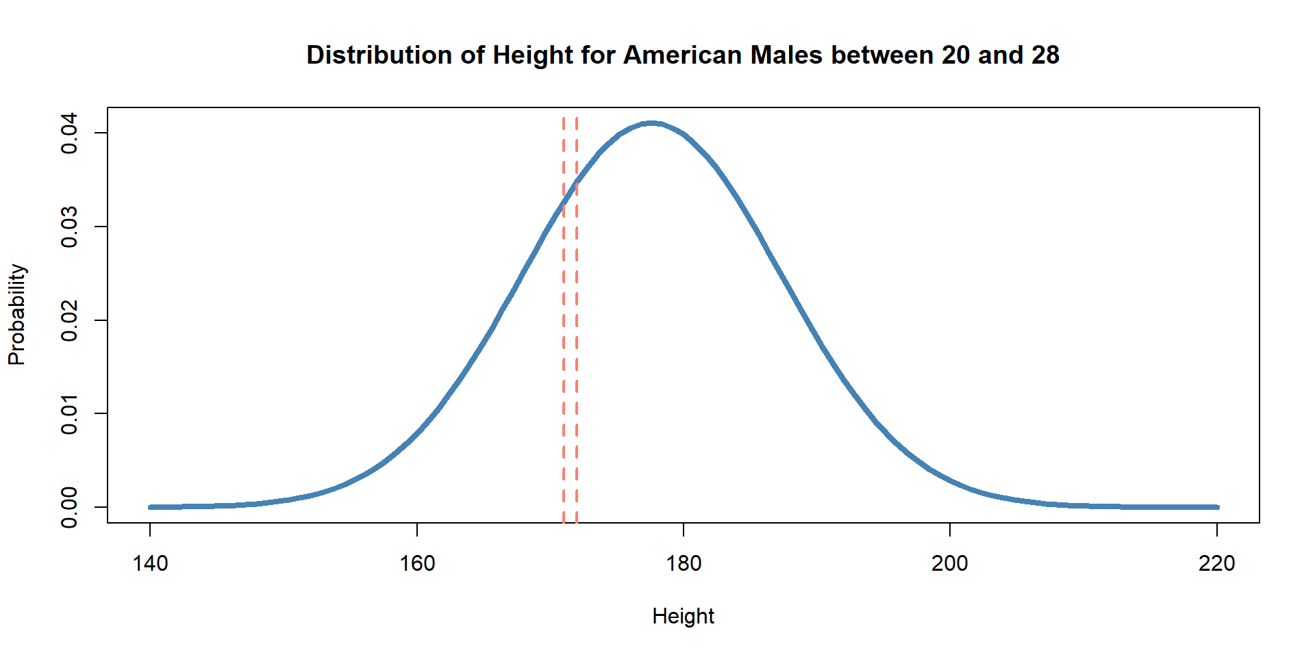 What is the probability of sampling one random man and him being between 170 and 171 cm?