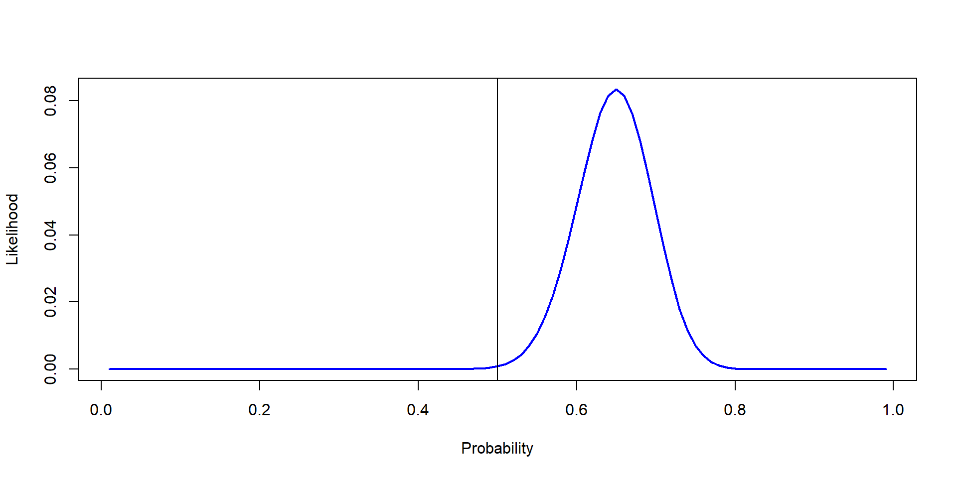 Likelihood: \(\mathcal{L}(65|p= 0.5 \; \& \; n=100)\)