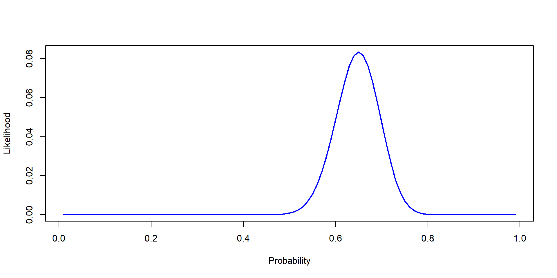 Likelihood: \(\mathcal{L}(65|p= 0.3 \; \& \; n=100)\)