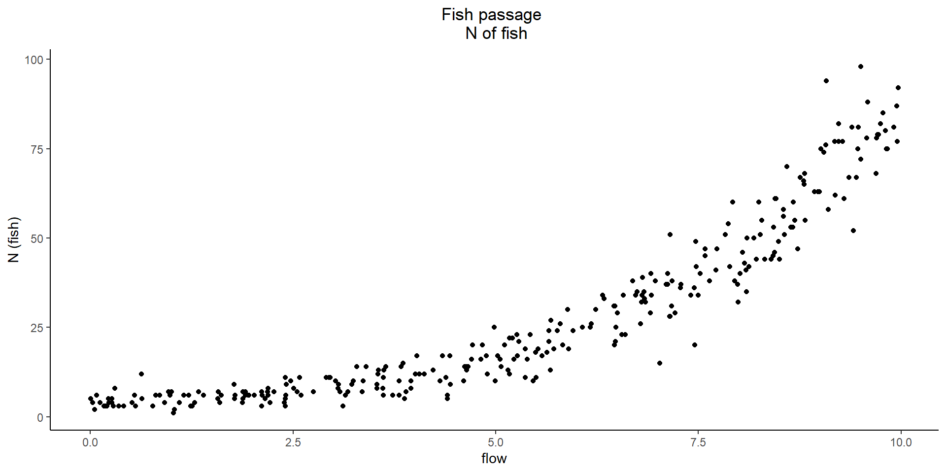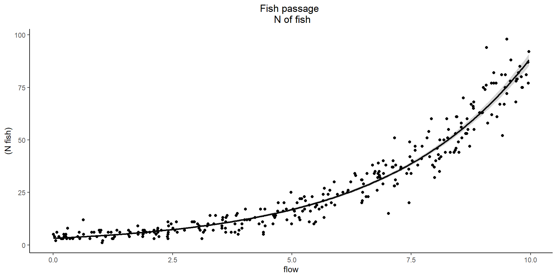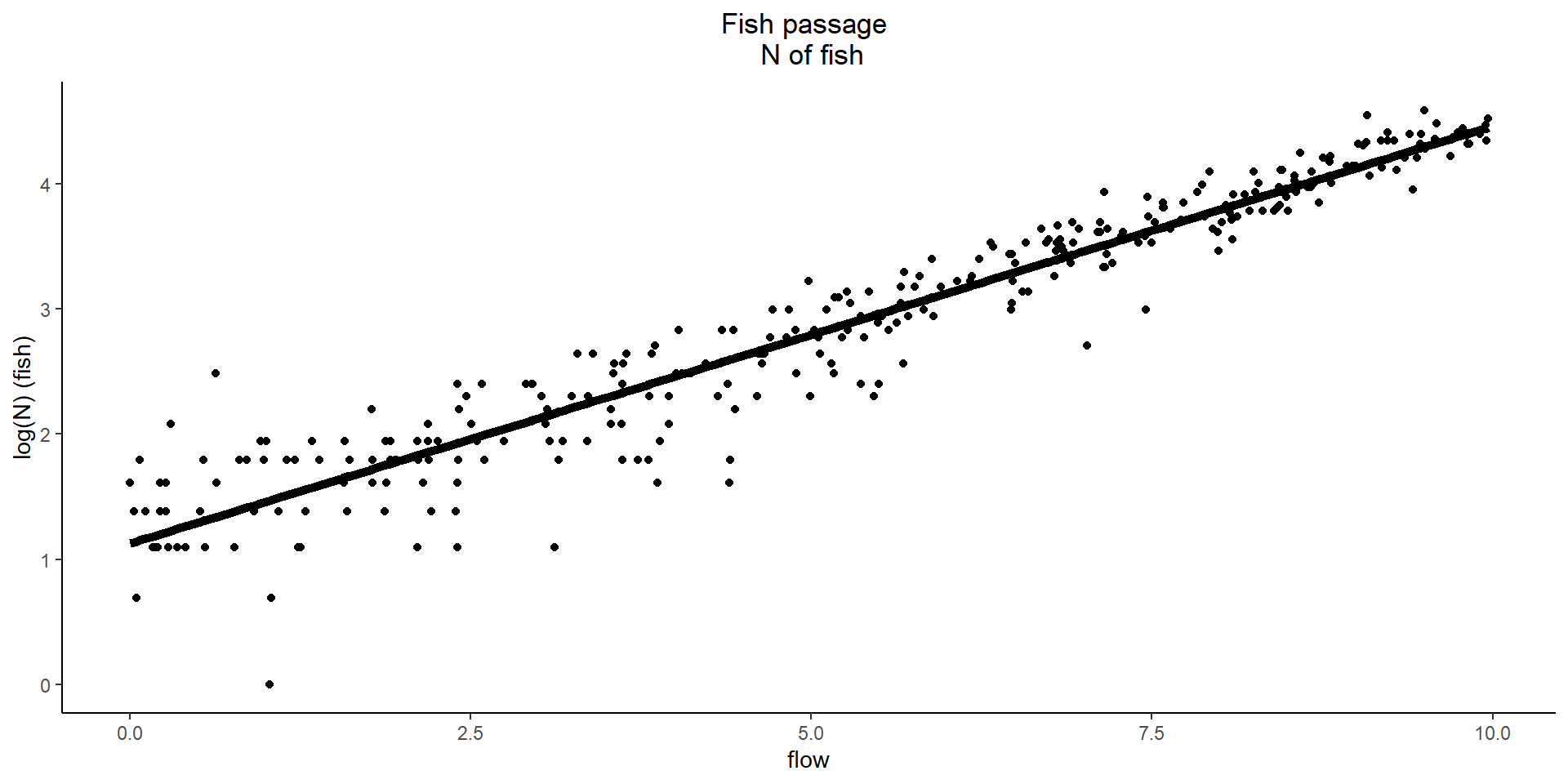 \[ \mu_i = e^{\beta_0 + \beta_1x_i} => \mu_i = e^{\beta_0 + \beta_1flow_i} \]