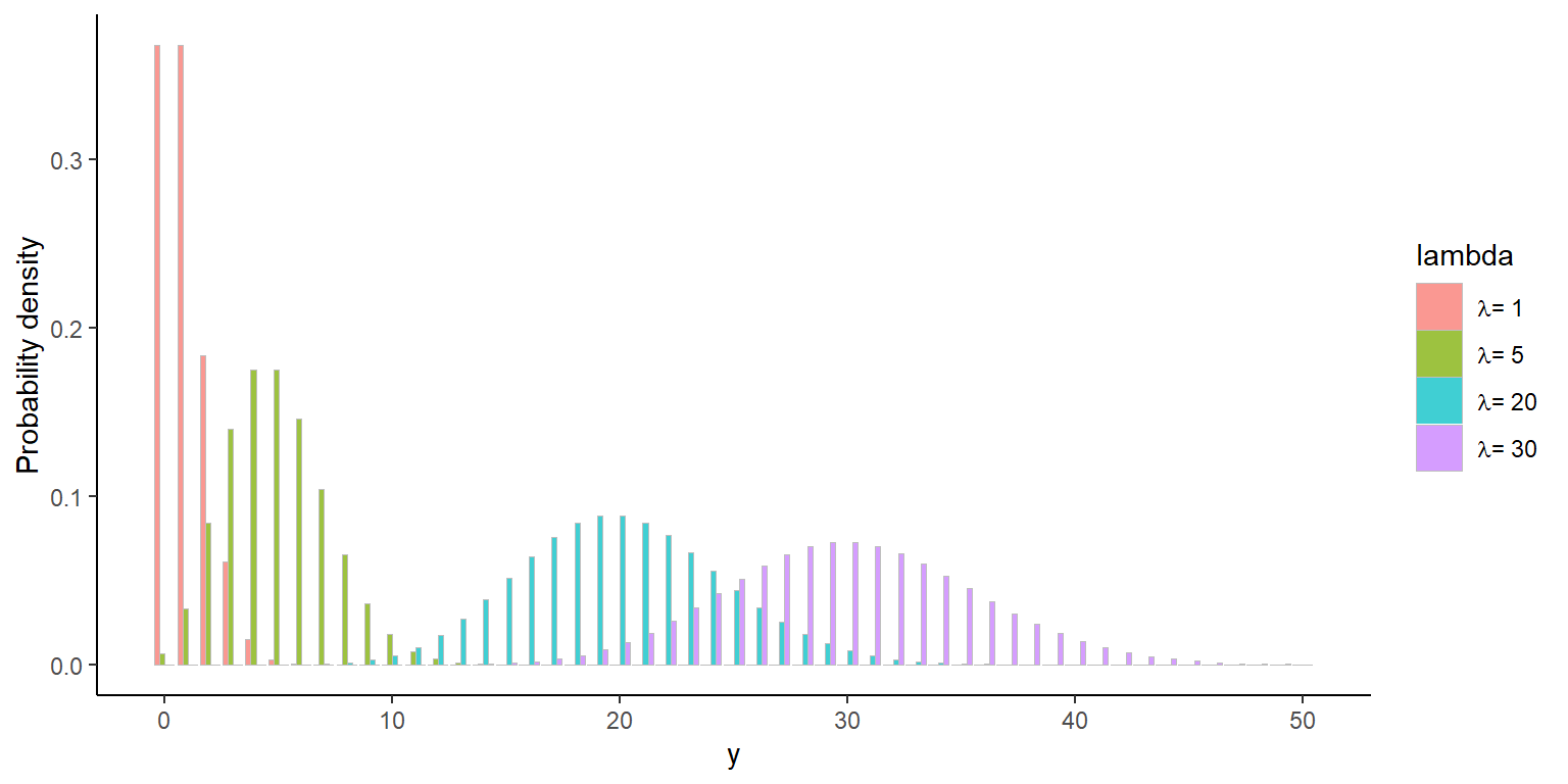 df <- data.frame(y = c(dpois(x, lambda = 1),dpois(x, lambda = 5), dpois(x, lambda = 20), dpois(x, lambda = 30)),