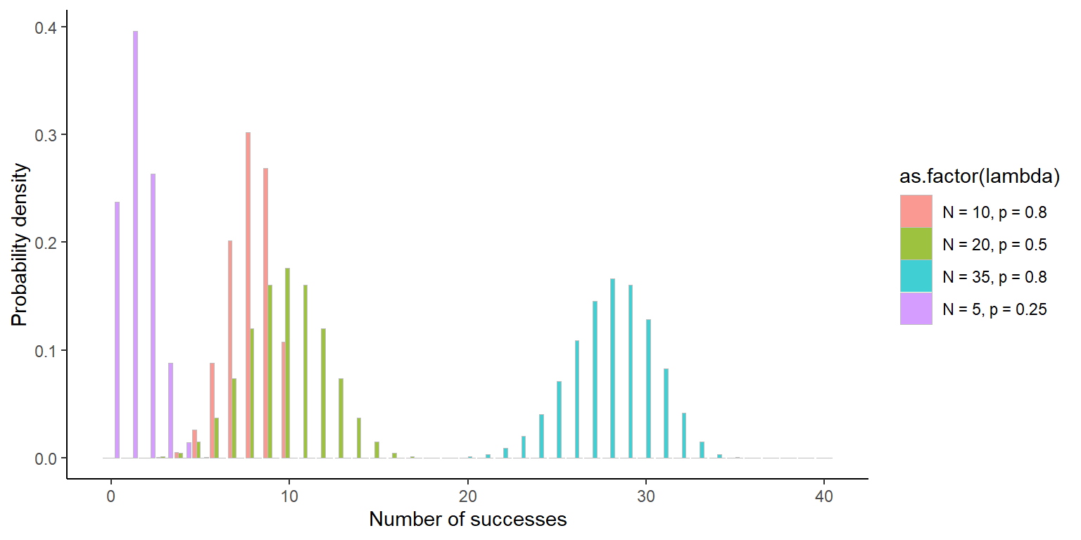 lambda = rep(c("N = 5, p = 0.25", "N = 10, p = 0.8", "N = 20, p = 0.5", "N = 35, p = 0.8"), each = length(x)))