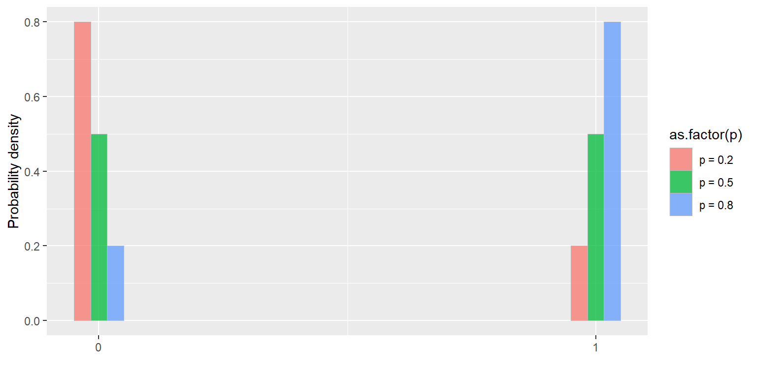 The Bernoulli distribution is very useful for data where the response variable is binary in nature (e.g., dead/alive, presence/absence, ). The parameter we estimate is \(p\) - the probability of “success”