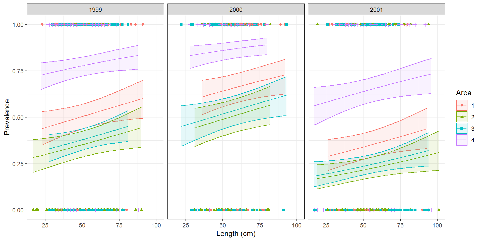 glm(formula = Prevalence ~ Length + Year + Area, family = binomial(link = "logit"),