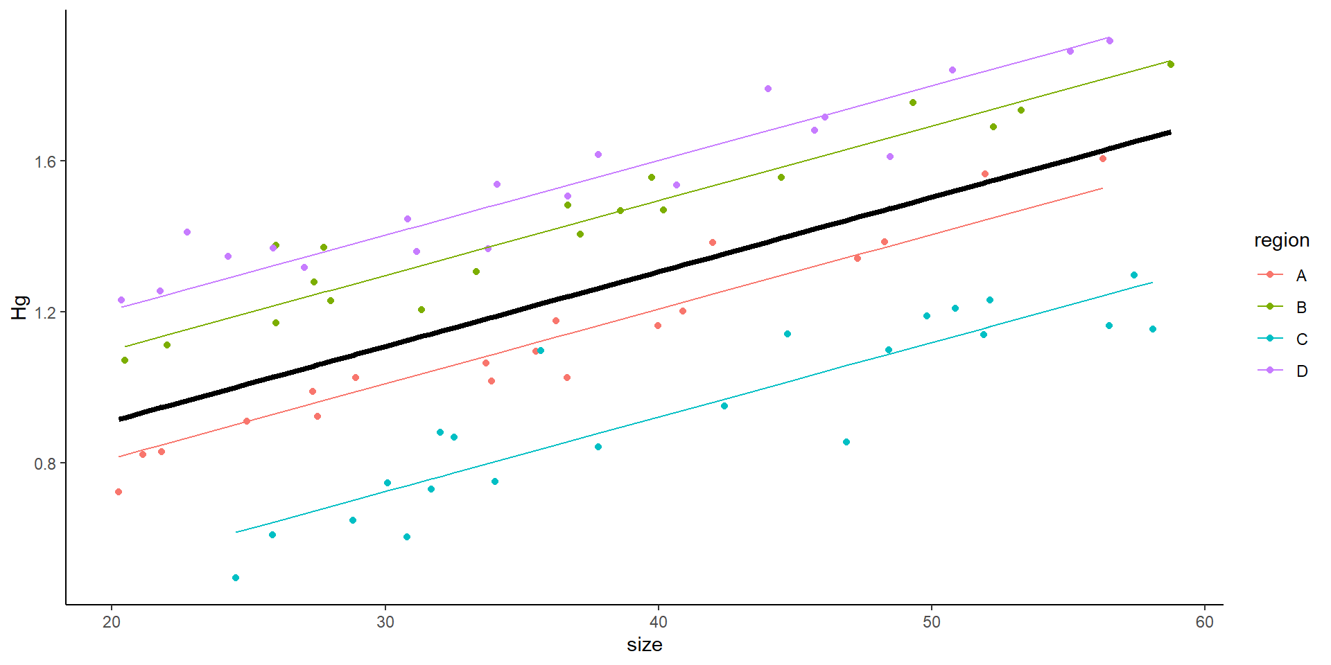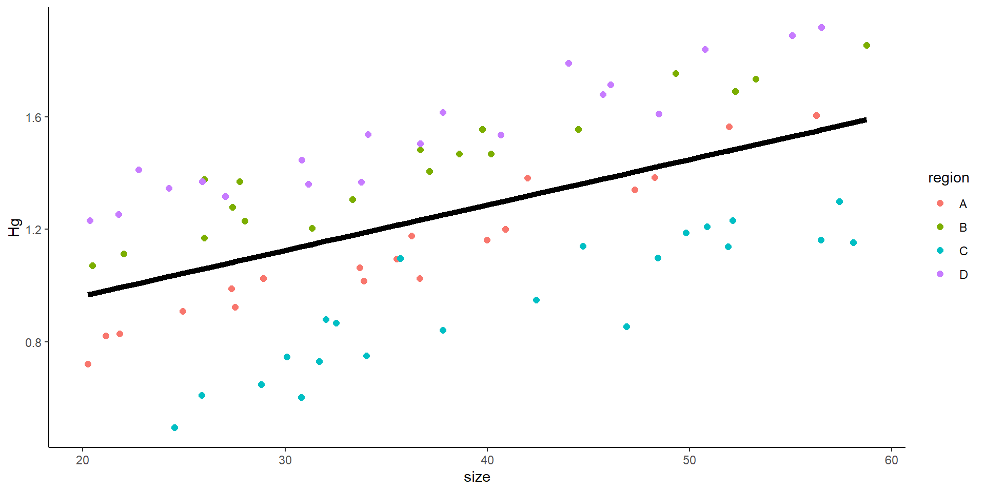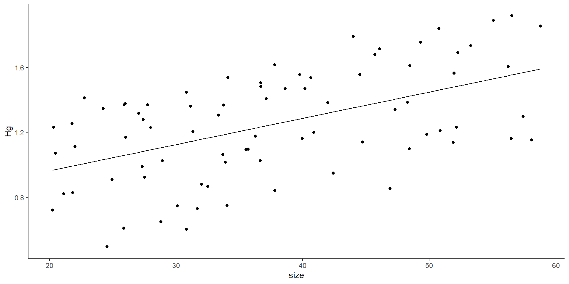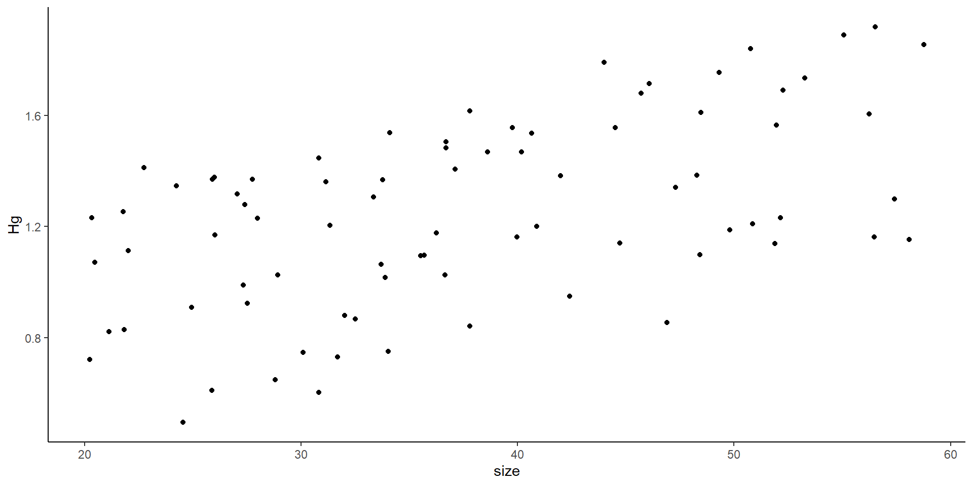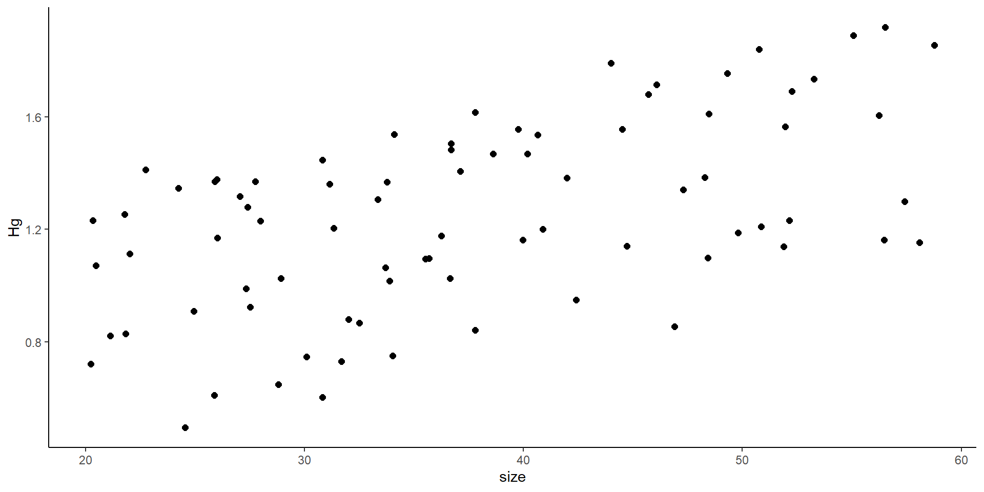 In the first example, we are looking at the relationship between size and Hg concentration, in order to know whether to publish a consumption advisory for fish over a certain size. So, far, we have looked at examples in which our sampling is “random”