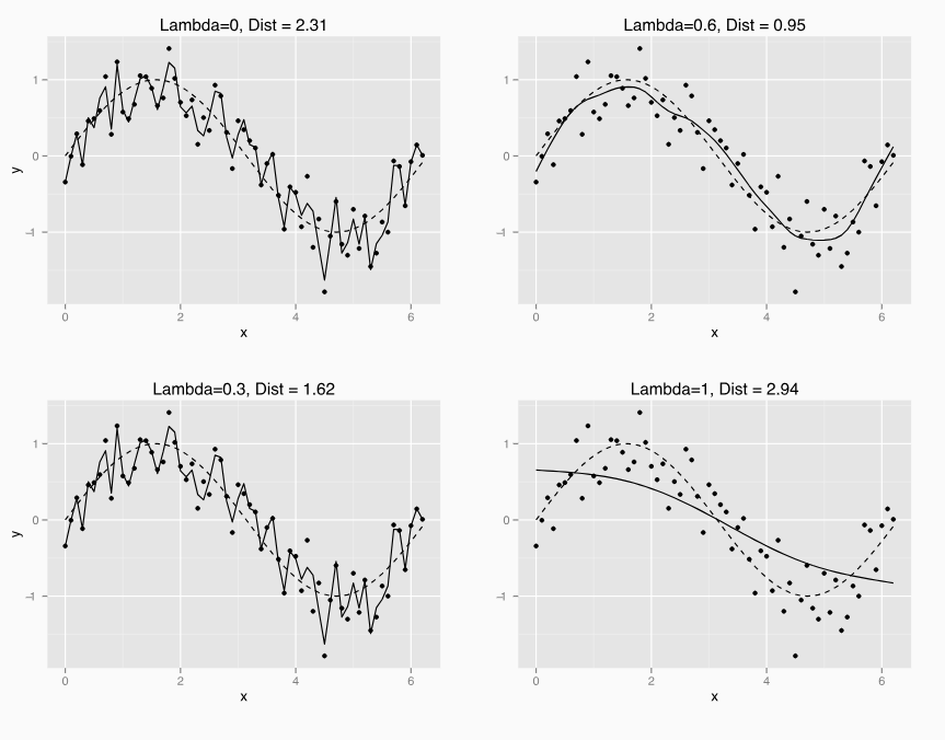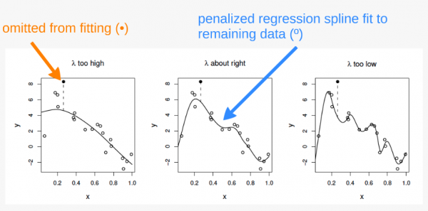 We use a term \(\lambda\) to penalize for wiggliness (Monday!) Many ways to estimate it… but what is important is that we are NOT TRYING TO MINIMIZE residuals!