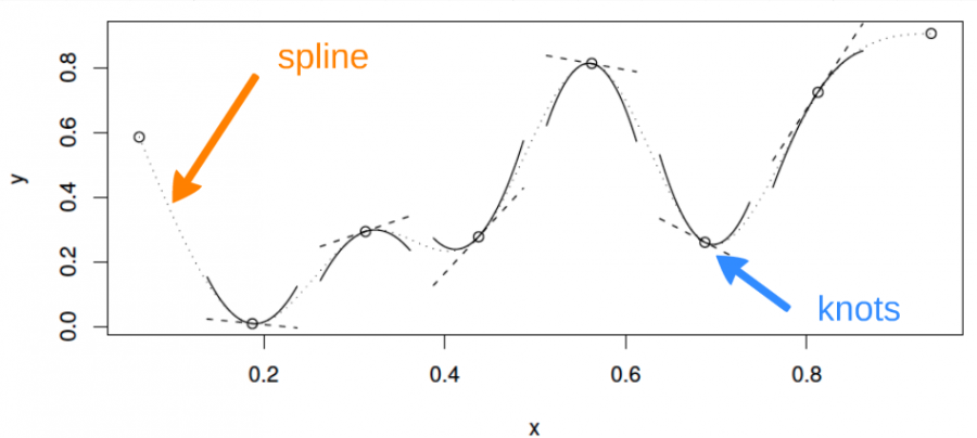 Knots: These are the specific points in the range of the predictor variable where the pieces of the spline function connect. The number and placement of knots determine the flexibility of the spline. More knots allow for more flexibility, but too many can lead to overfitting.