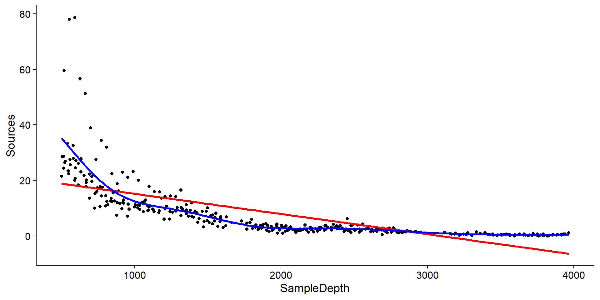 gam_model <-gam(Sources ~s(SampleDepth), data = isit2)ggplot(data = isit2, aes(y = Sources, x = SampleDepth)) +geom_point() +geom_line(aes(y =fitted(gam_model)), colour="blue", size=1.2)+theme_classic()