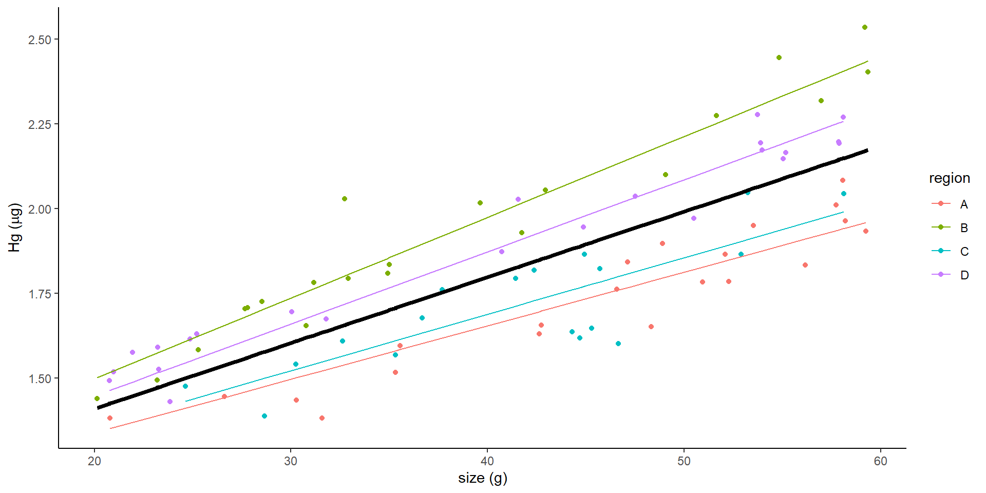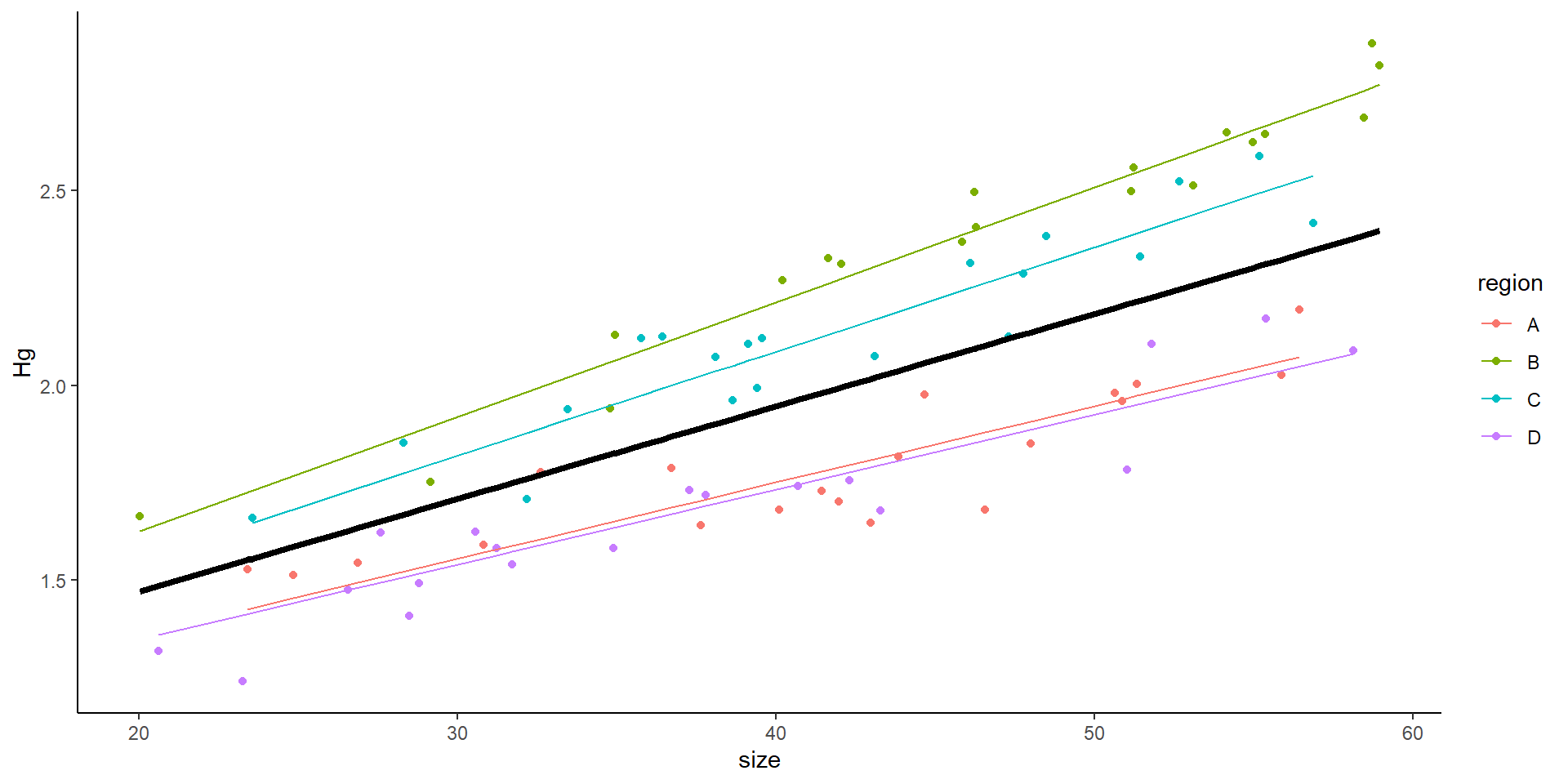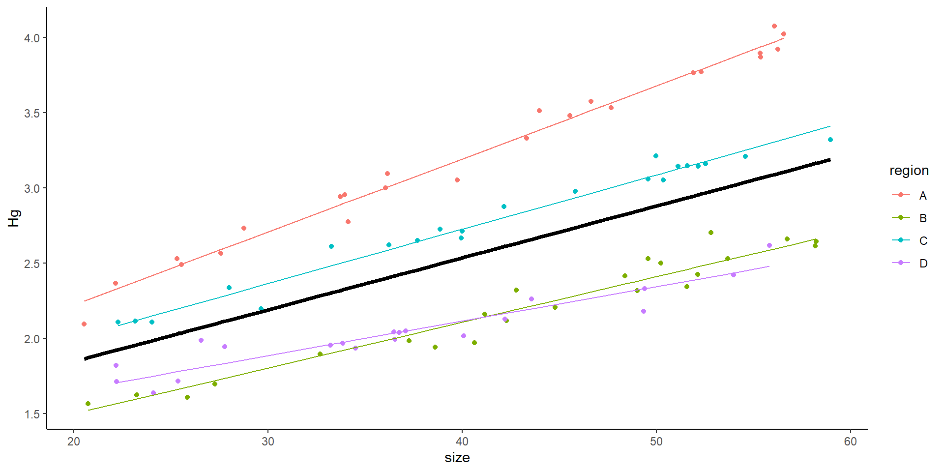 Hg_{ij} = \underbrace{(\beta_0 +\underbrace{\gamma_j}_{\text{Random intercept}})}_{intercept} + \underbrace{\beta_1size_{i}}_{slope} +\underbrace{\epsilon_i}_\text{ind var}